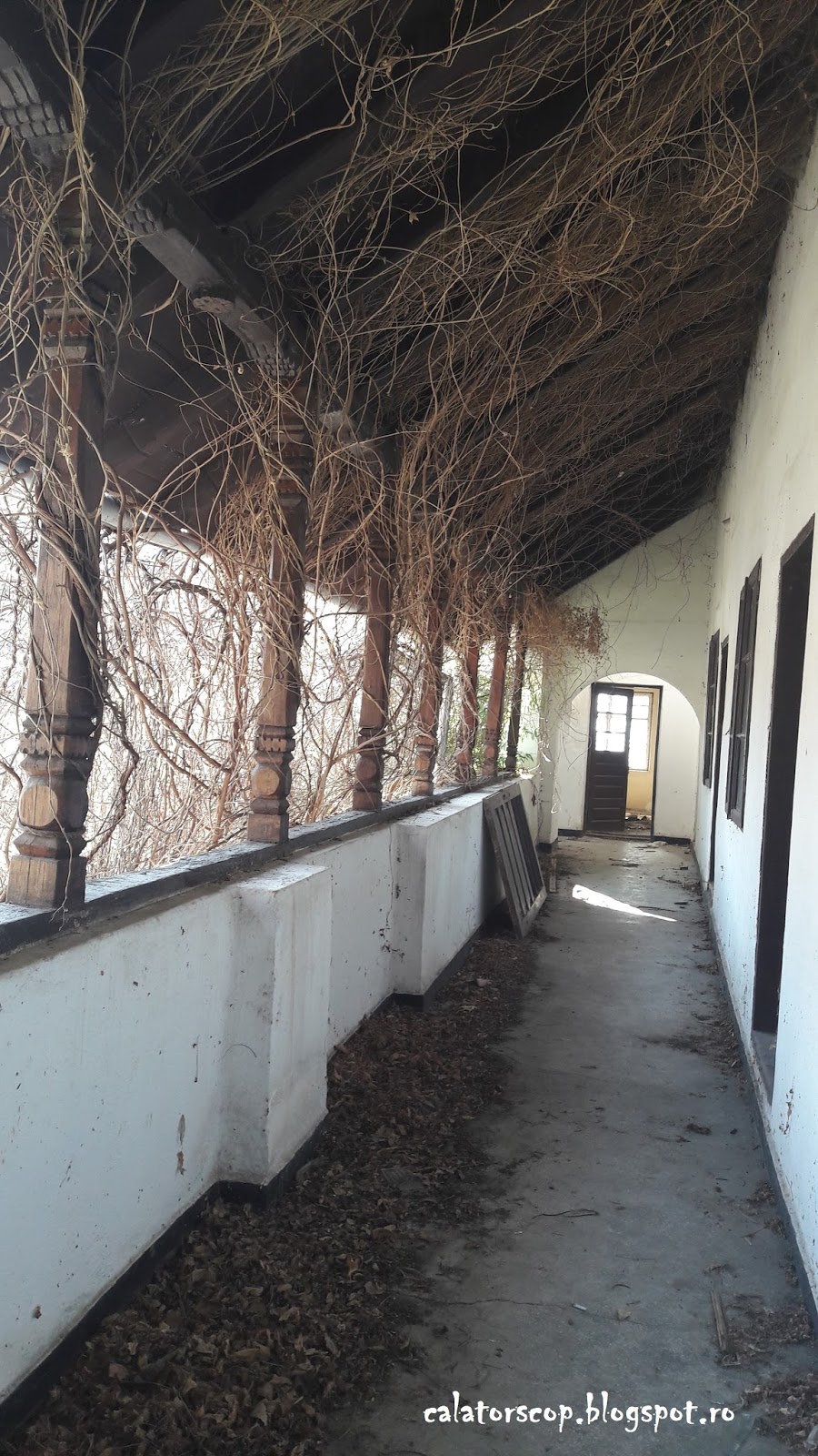 Am patruns asadar prin poarta de fier intredeschisa si dintr-o data ne aflam intr-o curte interioara, patrata asemeni unui han din vremurile de demult. Peste tot cioburi, lemne, grinzi prabusite si natura care, usor, usor acaparase locul si isi reintra in drepturi. Fara falsa modestie va spun ca ne-a incercat un sentiment de tristete si dezamagire, ca un astfel de loc ar putea disparea. Am urcat pe treptele de piatra, inca tapene pana la primul etaj, si am dat un tur al balconului ce inconjoara curtea. Incaperile micute sunt goale si golite de tot ce avea in ele. Stalpii de sustinere frumos scluptati erau acoperiti de o iedera aproape uscata, iar peisajul parea dezolant. Ne-am intrebat in soapta: de ce?
